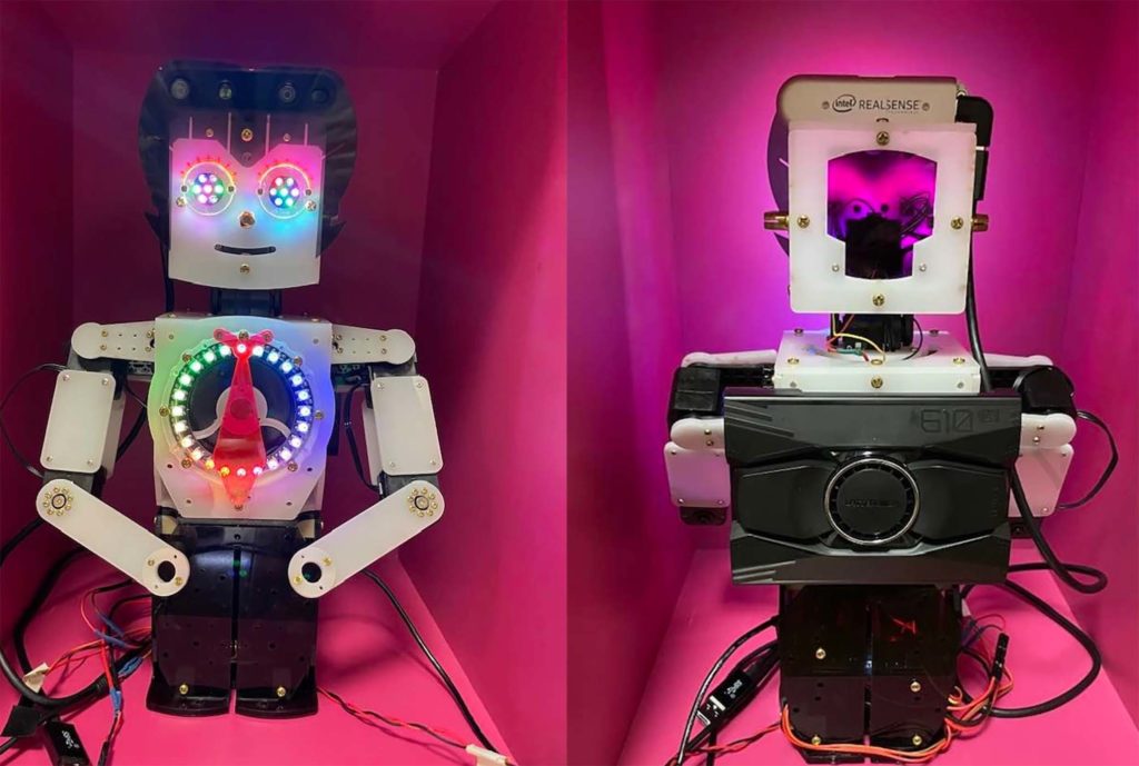 3D RGB camera and Depth sensors are used for surrounding object recognitions with Deep-Learning based software, such as human hand shape recognition for rock/paper/scissors game, voice synthesis is used, such as reading books, telling trivia, telling current weather, and so on. Echo-cancelling microphone array is used to recognize human voice controls to the robot. Each of these capabilities and robot servo motor controls are integrated as ROS node (Robot Operating System)