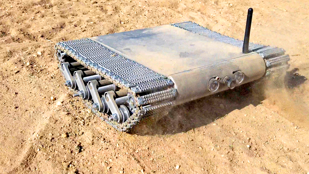 The method of locomotion is a continuous track, created using steel roller chain loops connected with fasteners to 3D printed links. These loops sit on a custom designed drive and idler sprocket supported by four shock absorber loaded roller pins that work as the suspension. The drive sprockets are driven by dedicated planetary geared motors ultimately controllable in speed and direction by a mobile device via a long range external antenna connected to a raspberry pi. For vision, there is a front mounted camera with adjustable focus and zoom controlled by two stepper motors, and a second night-vision camera on an articulating and extending arm for surveillance operations. These operations can also be conducted remotely via high-security WiFi access point from the raspberry pi.