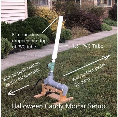 Candy in a 35mm film container is launched towards a trick-or-treater when they step on a foot pedal 50 feet away from the launcher.