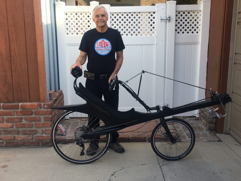 My project is a recumbent bicycle powered by the rider using a rowing motion rather than the usual circular pedaling motion (see YouTube). My latest iteration will be mounted on a stand so faire goers can “ride” it and experience whole-body exercise and a fun ride (when not on the stand) while going places without consuming fossil fuels or polluting the environment.