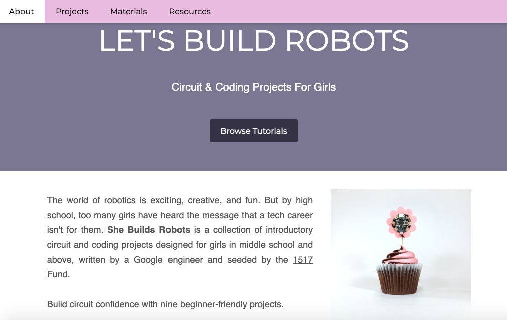 I walked away from the competition with an open-ended grant from the 1517 Fund and instantly knew I wanted to work on an educational resource – something more exciting than a textbook that could draw on the same visual appeal as my hackathon dress. Less Big Bang Theory and more what-if-Coco-Chanel-knew-about-conductive-thread. So I prototyped, visited classrooms, stuck circuit boards in cupcakes, and built a website: www.shebuildsrobots.org.