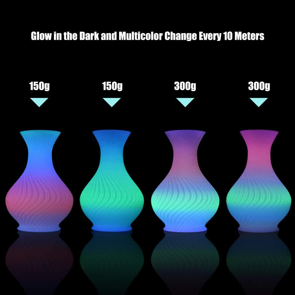 GLOW MULTICOLOR CHANGE - Every 10 Meters color change with Green,Blue,Purple and Pink. Exposure to the strong sunlight or UV light for only 30 minutes will get an amazing glow effect, but too long exposure time may damage the glow filament. Glow green pla filament has the best luminous effect, then glow blue filament, glow deep blue purple filament, shiny glow green filament, glow red filament, glow pink filament