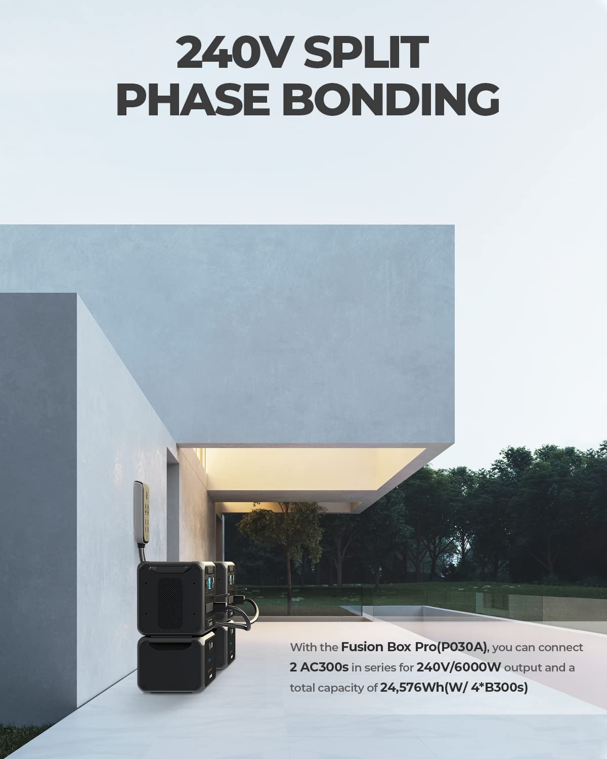 - Unparalleled 6000W Output: Integrate 2 sets of AC300 with BLUETTI P030A funsion box to get double power/voltage 6000W/240V, allowing you to run your large appliances such as air conditioner, clothes dryer, heater, and more.