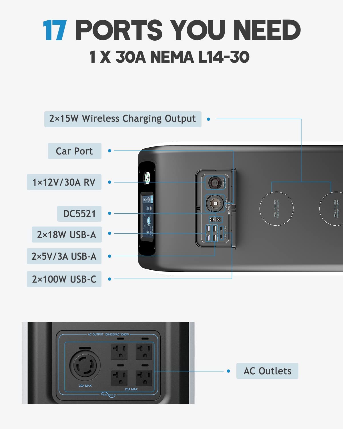 - 17 Versatile Ports: Feature a NEMA 14-30 Receptacle for electric dryers, 12V/30A RV port for vandwellers, 15W wireless chargers, and more versatile ports like 3000W AC/100W USB-C/36W USB-A/DC 5521.