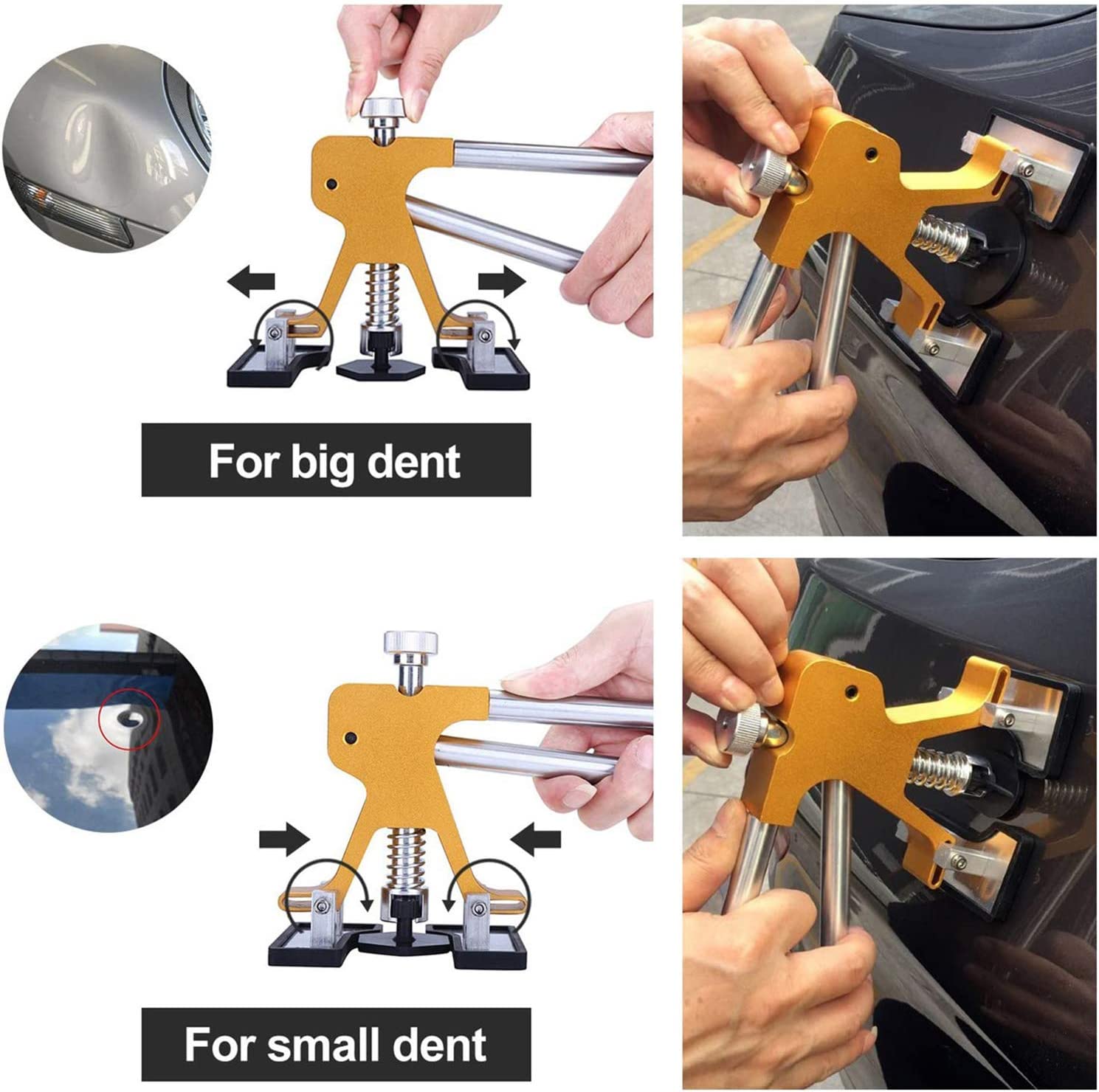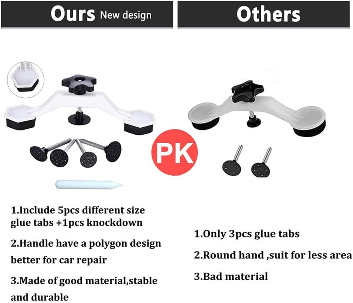 UPGRADE DESIGN: Compared to the old version paintless dent repair kit, the new dent lifter can adjust more 1 cm height and more 3.8cm width, some glue tabs have thicker and big diameter, it will more effective and durable to puller the dent. In addition, the unique arched bridge design eliminates the chance for additional damage.