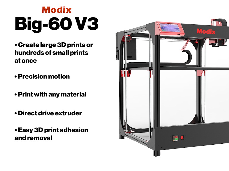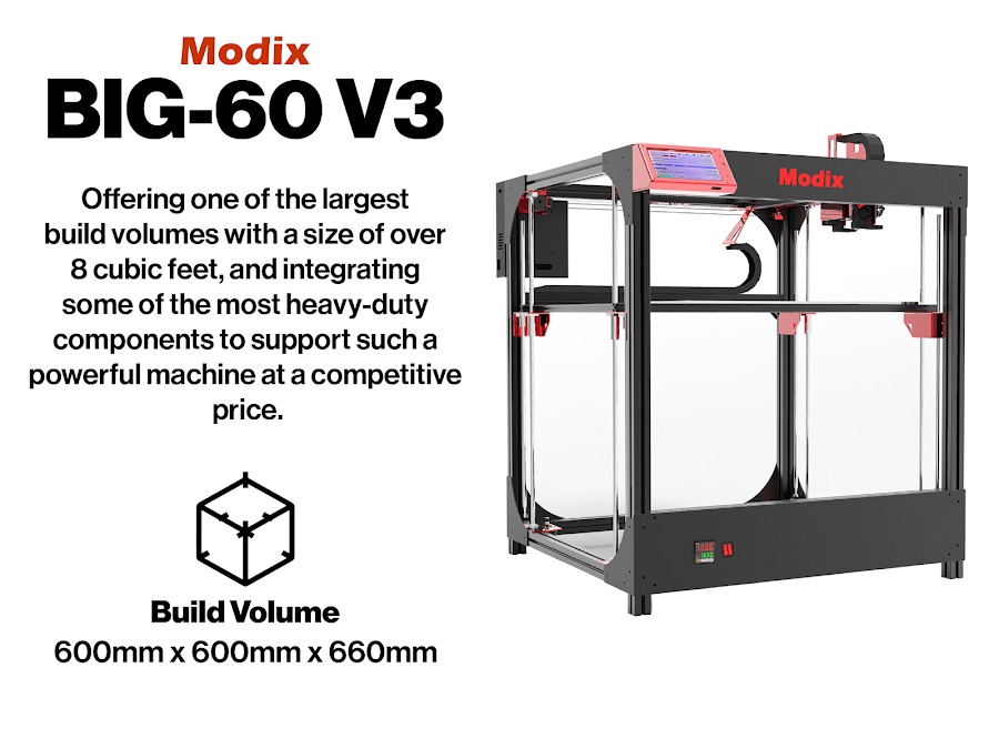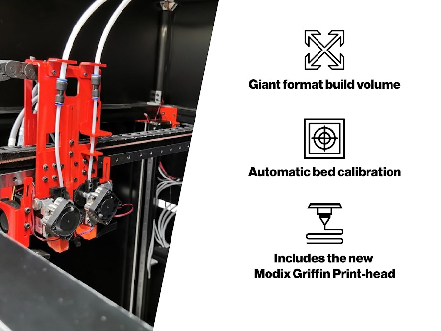 The Modix BIG-60 V4 is a giant format 3D printer with a huge build volume, dual zone MIC-6 build plate, and genuine HIWIN linear rails. It is also equipped with the new and improved Griffin print head.