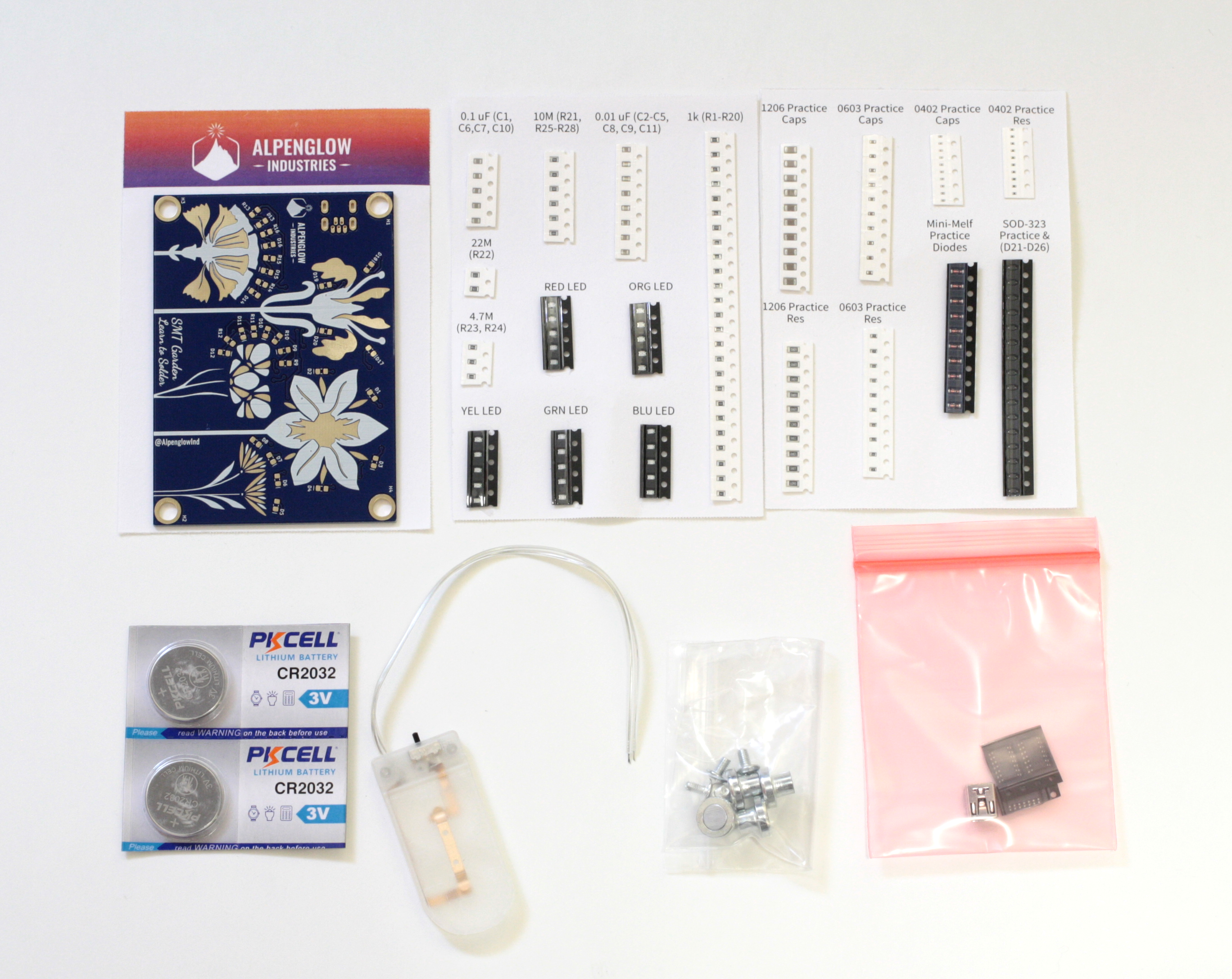 - With our official learn to SMT solder kit you will be able to practice soldering different sized components ranging from 1206 all the way down to 0402. We also included mini-melf and SOD-323 diodes. There are "practice stalks" that have some grounded pads to give you some experience soldering to pads with heat sinking. The 0805 components are part of the circuit along with two dual 555 timers and an inverter which create 5 different blinking rates. We've included a bunch of different colored LEDs so you can choose whichever colors you want for your flowers!