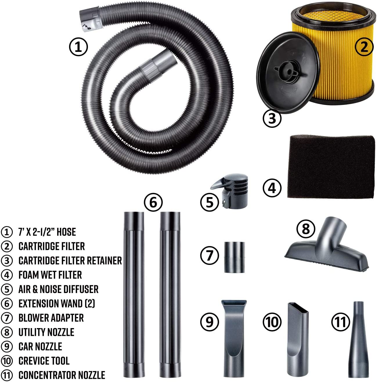- INCLUDED ACCESSORIES: 7' x 2-1/2" Secure Fit Hose, (2) Extension Wands, Utility Nozzle, Crevice Tool, Car Nozzle, Concentrator Nozzle, Blower Adapter, Air/Noise Diffuser, Standard Cartridge Filter and Foam Wet Filter.