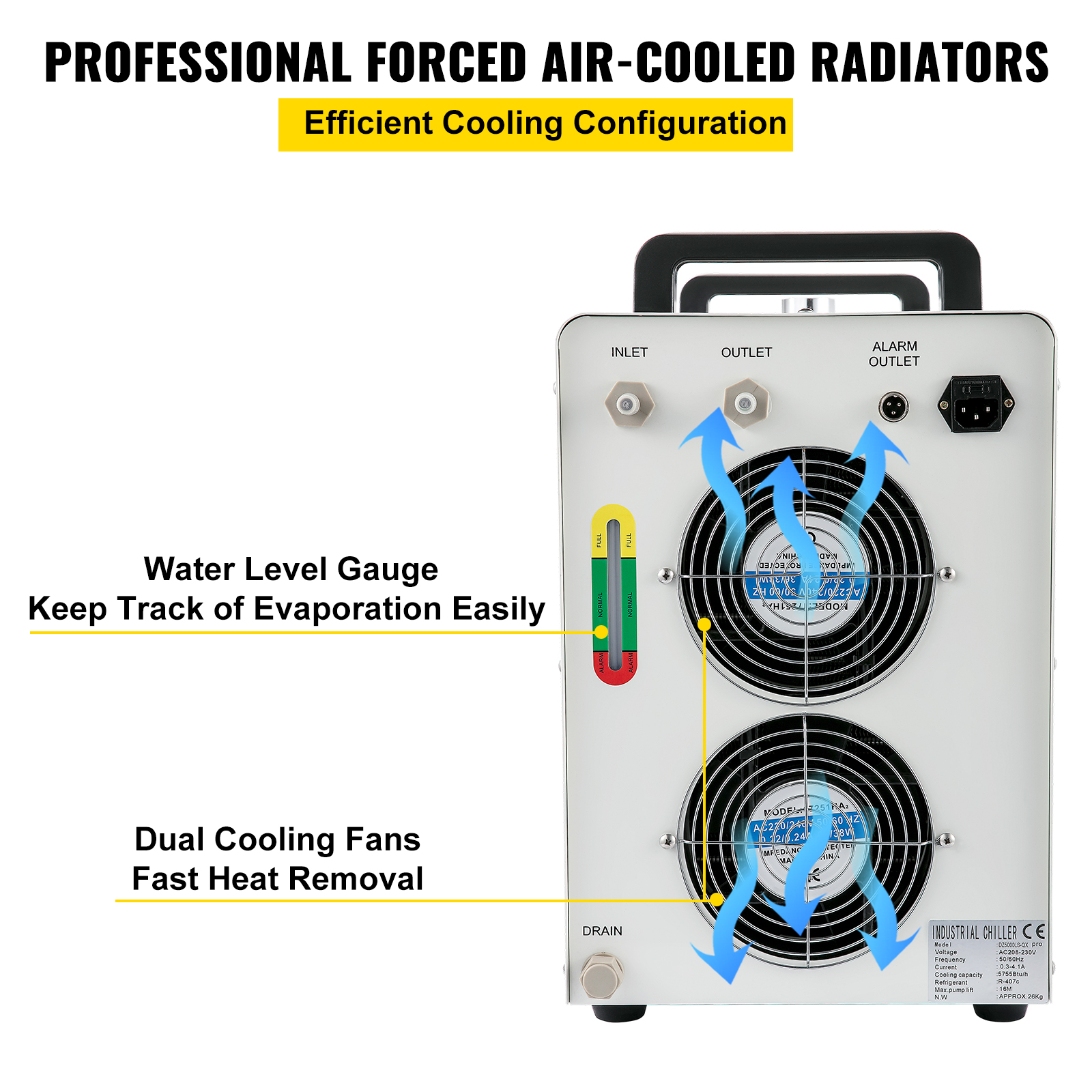 - Strong Heat Dissipation Capacity: The water chiller has two professional forced air-cooled radiators, high heat dissipating capacity, and cannot easily be blocked. It uses a standard R410a refrigerant to keep laser cutting and engraving machines cool during use.