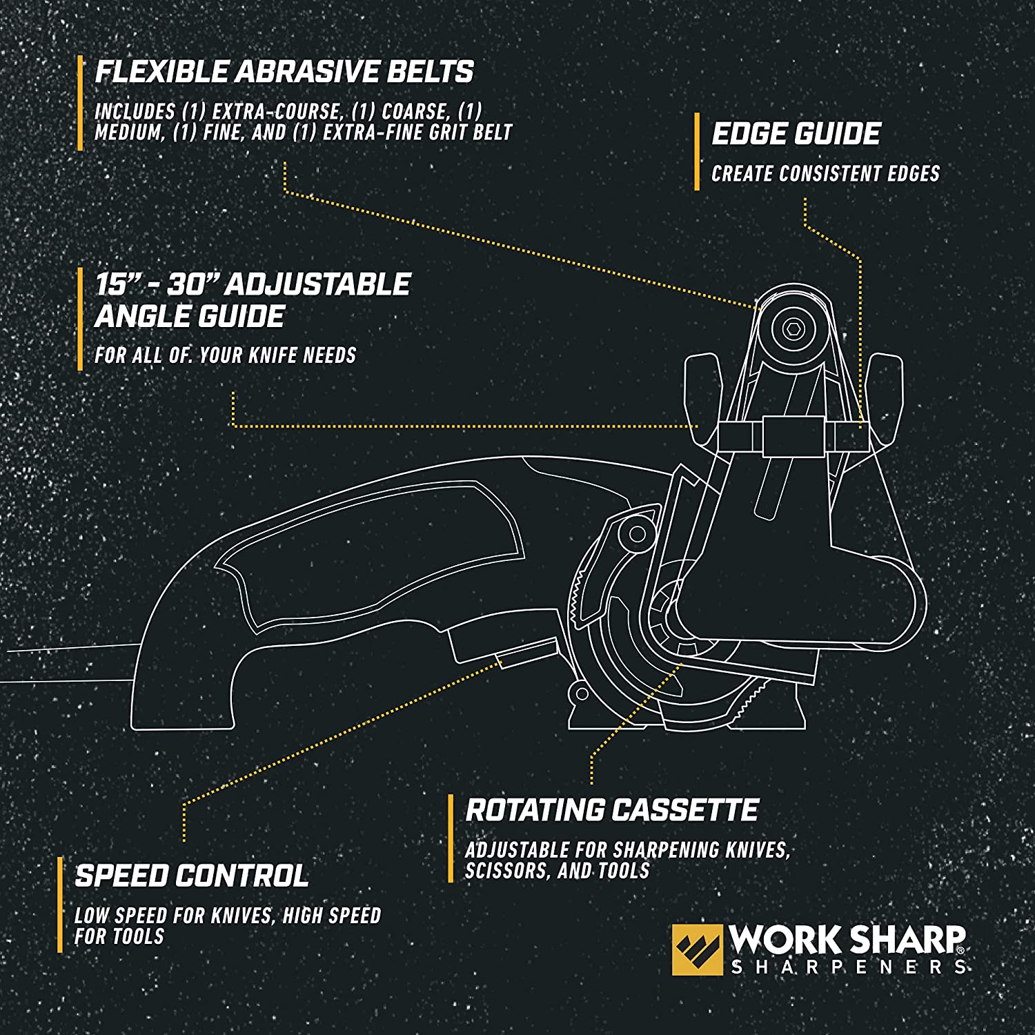 VARIABLE SPEED MOTOR - handle every sharpening task, from grinding to honing. More power with improved cooling & the option of slow speed honing or high speed grinding. The variable speed control (1, 200 SFM to 2, 800 SFM) provides you with the optimal belt speed for the task at hand